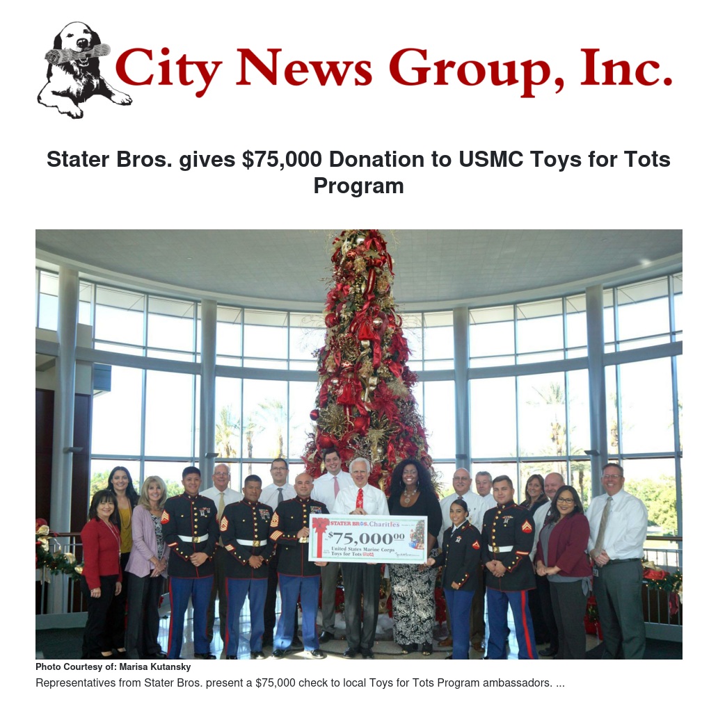 Since 2005, Stater Bros. has proudly partnered with the United States Marine Corps. (U.S.M.C.) Toys for Tots program to bring joy to families in need during the holiday season. On December 6, representatives from Stater Bros. gathered to present a $75,000 check to local Toys for Tots Program ambassadors. Funds from this donation are used to purchase new toys for disadvantaged children in the communities Stater Bros. serves.