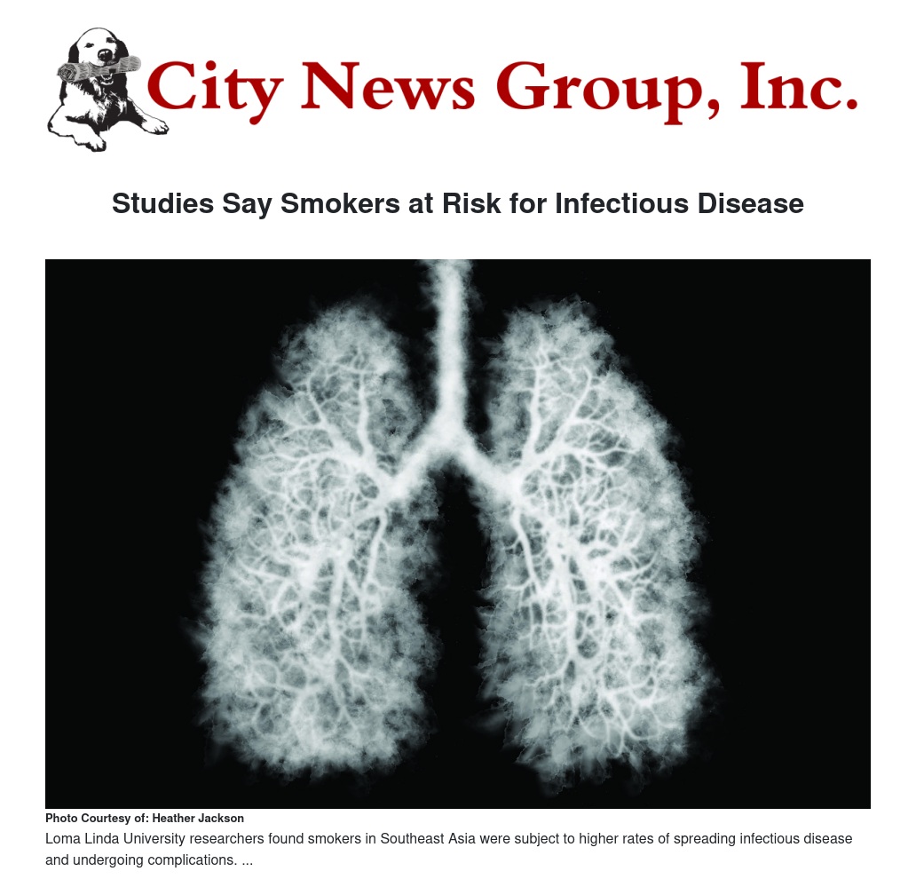 Researchers from Loma Linda University in recent years have conducted two studies in Southeast Asia showing that those who smoke are at greater risk of contracting infectious disease and spreading infectious disease. The researchers say the estimated 34 million adults in the United States who smoke may also be at greater risk of complications from COVID-19.
