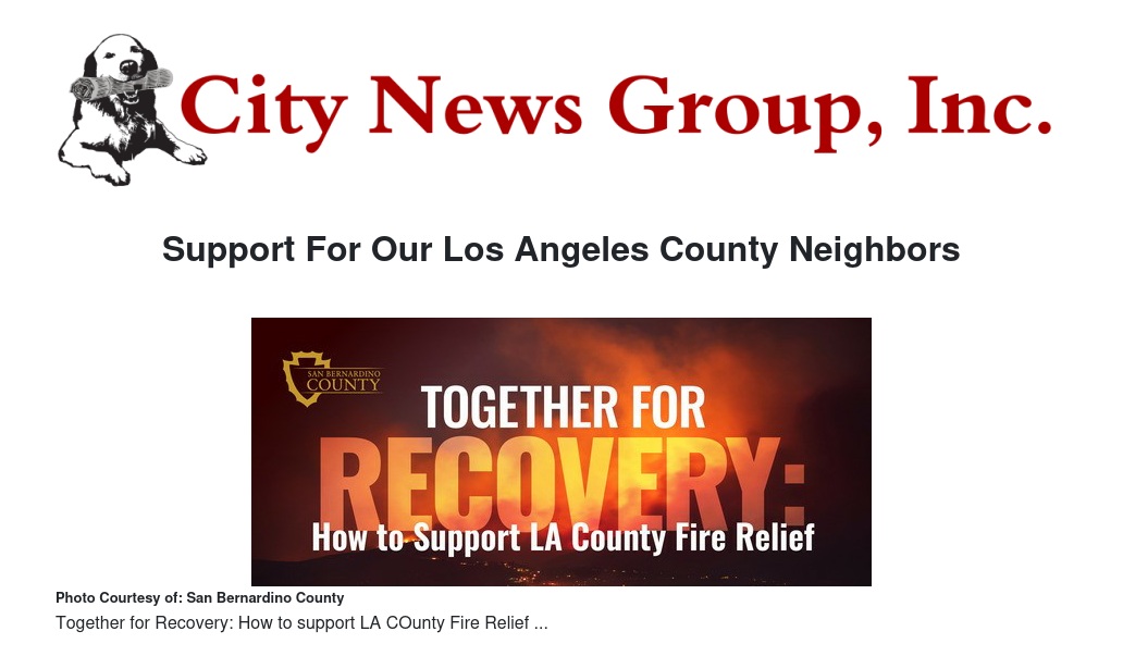 San Bernardino County firefighting resources are on the front lines in Los Angeles County, but there are ways all of us can support those in need. Los Angeles County emergency response and recovery officials are urging donations to the California Community Foundation’s Wildfire Recovery Fund, https://www.calfund.org/.