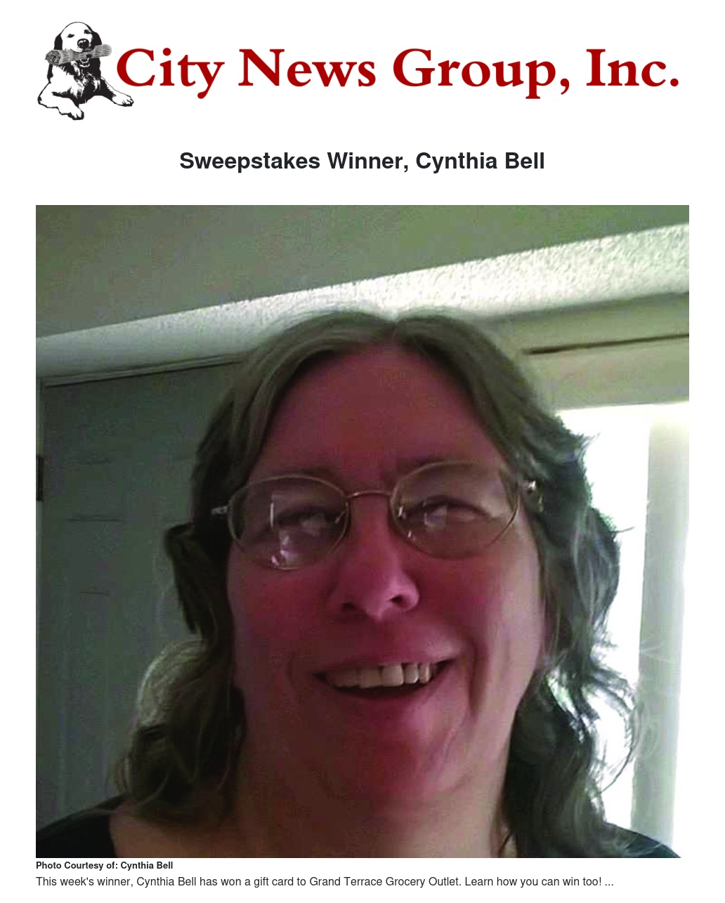 This week’s winner is Cynthia Bell, resident of Grand Terrace who loves to watch TV, play with her puppy, and play computer games.