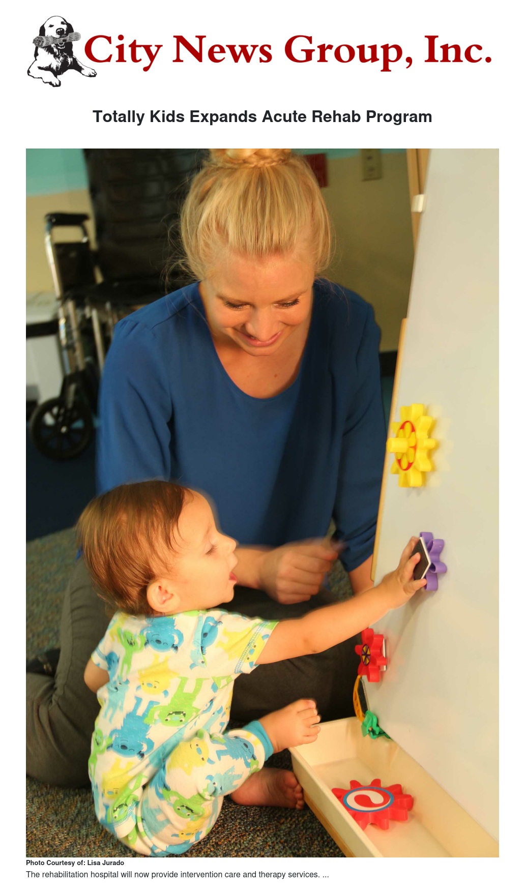 Serving children and their families for nearly 50 years, Totally Kids is regarded as a national leader in providing personalized rehabilitation and habilitation services for children with a family-centered emphasis. Totally Kids offers a full array of resources for children who are recovering from physical trauma or surgery or have suffered catastrophic illness and those dependent on technology through a portfolio of acclaimed programs and services that includes acute pediatric rehabilitation (both inpatient and outpatient), subacute, pediatric day health and residential intermediate care. Find out more about Totally Kids Rehabilitation Hospital at TotallyKids.com, or follow us on Facebook at facebook.com/totallykidsrehab.