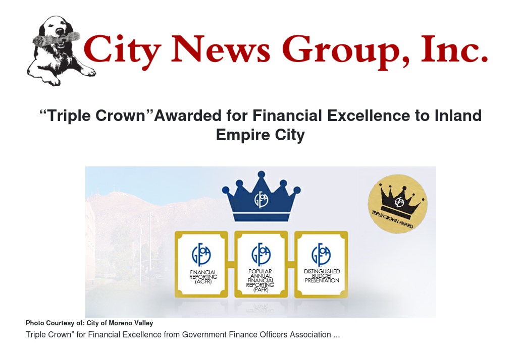Moreno Valley recently received three top honors from the Government Finance Officers Association (GFOA), including the Certificate of Achievement for Excellence in Financial Reporting (ACFR) Award, the Popular Annual Financial Reporting (PAFR) Award, and the Distinguished Budget Presentation Award for 2024. This marks the sixth time the City has received GFOA’s “Triple Crown.”