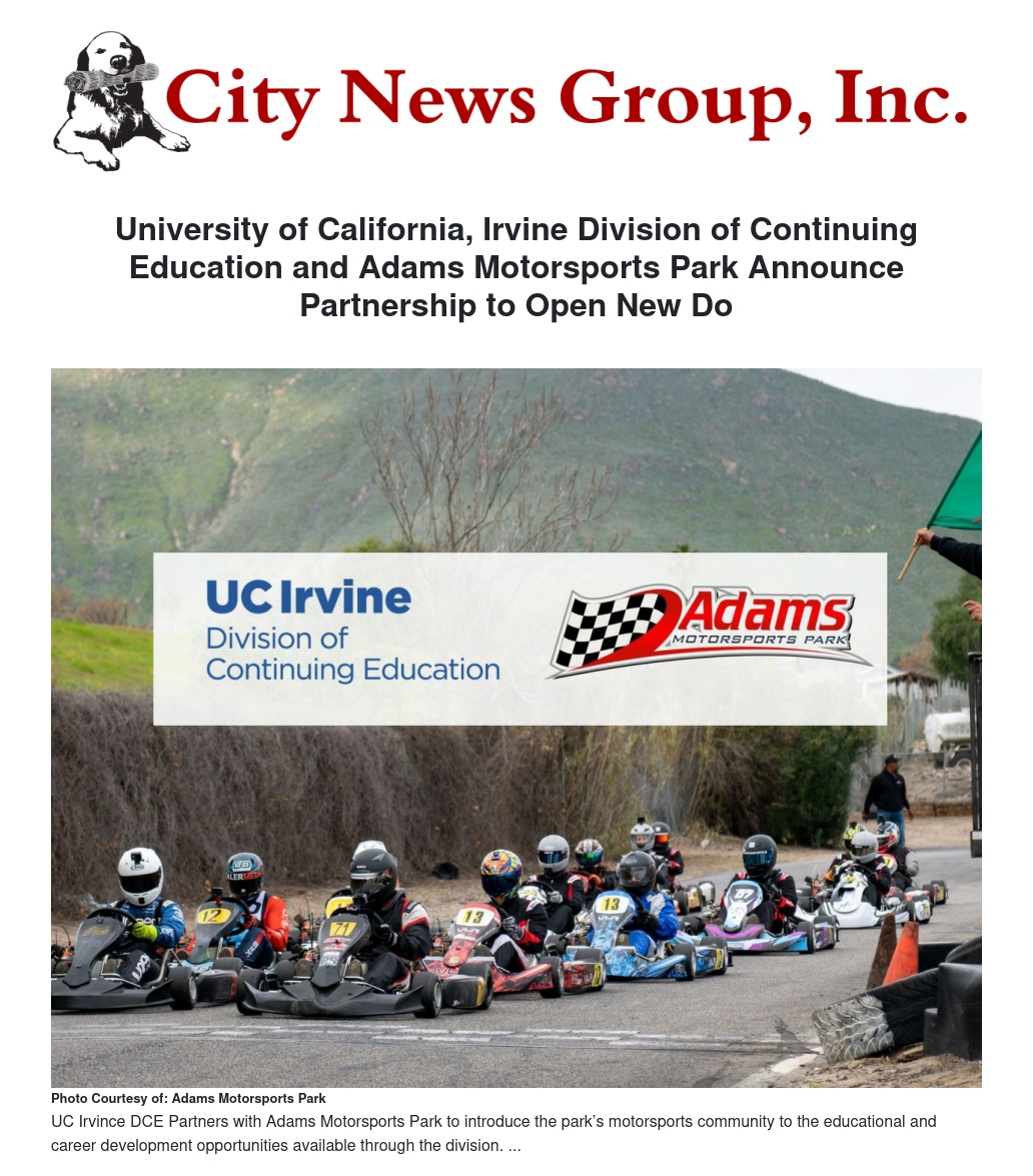 University of California, Irvine Division of Continuing Education and Adams Motorsports Park Announce Partnership to Open New Do by Justus Baker-Postell - City News Group, Inc.